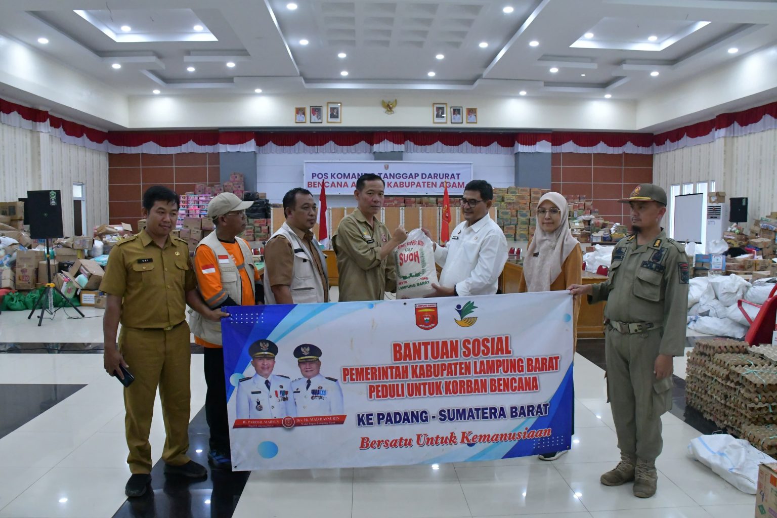 Bantuan tersebut diserahkan langsung oleh Kepala Dinas Sosial Kabupaten Lampung Barat, Aliyurdin, dan diterima oleh Kepala Pelaksana Badan Penanggulangan Bencana Daerah (BPBD) Kabupaten Agam, Rahmad Lasmono, di Pos Komando Tanggap Darurat Bencana Kabupaten Agam, Lubuk Basung.