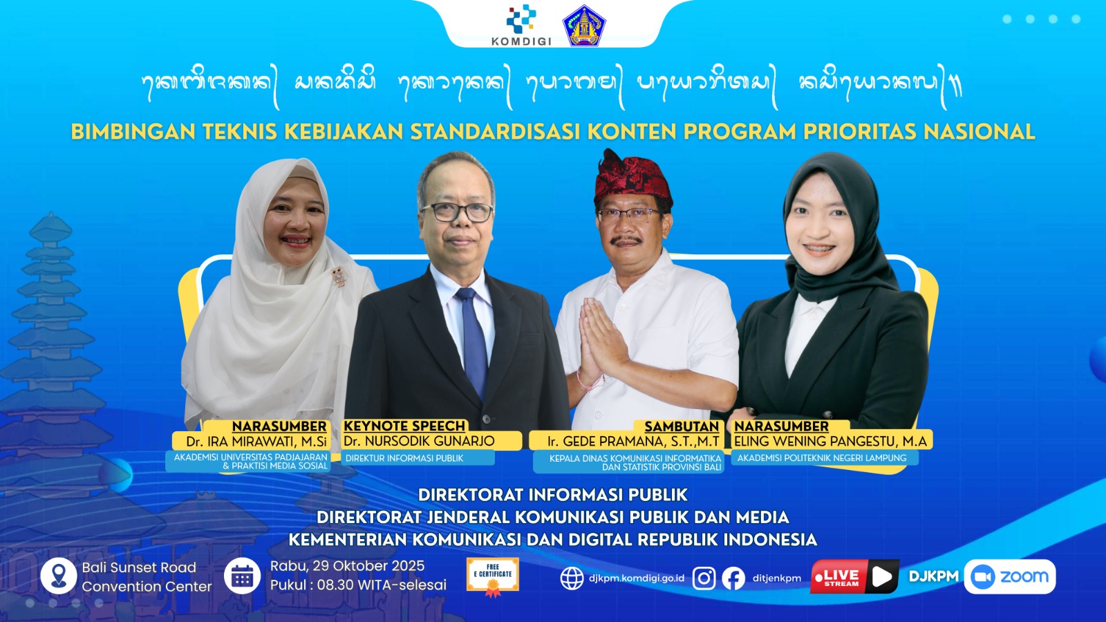 Time Indonesia — Komunikasi publik yang akurat dan beretika menjadi fondasi penting dalam membangun kepercayaan masyarakat terhadap pemerintah. Isu strategis ini akan menjadi fokus pembahasan dalam Bimbingan Teknis (Bimtek) Kebijakan Standardisasi Konten Program Prioritas Nasional yang digelar di Denpasar, Bali, Rabu (29/10/2025).