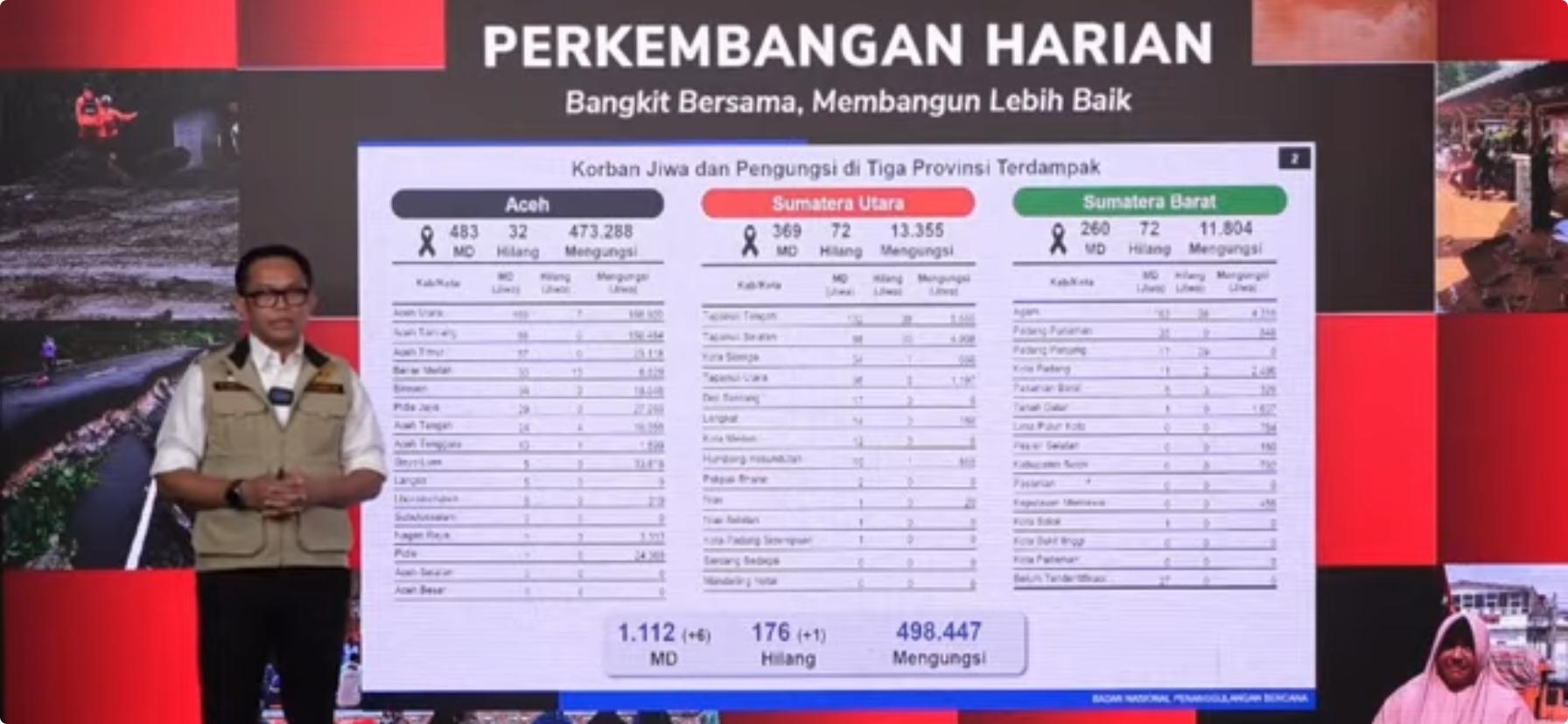 Time Indonesia — Pemerintah terus mempercepat penanganan dampak hujan ekstrem yang memicu banjir dan longsor di tiga provinsi, yakni Aceh, Sumatra Utara, dan Sumatra Barat. Hingga Selasa (23/12/2025), jumlah korban meninggal dunia tercatat 1.112 jiwa, bertambah enam orang dibandingkan hari sebelumnya, sementara 176 warga masih dinyatakan hilang dan terus dilakukan pencarian oleh tim SAR gabungan.